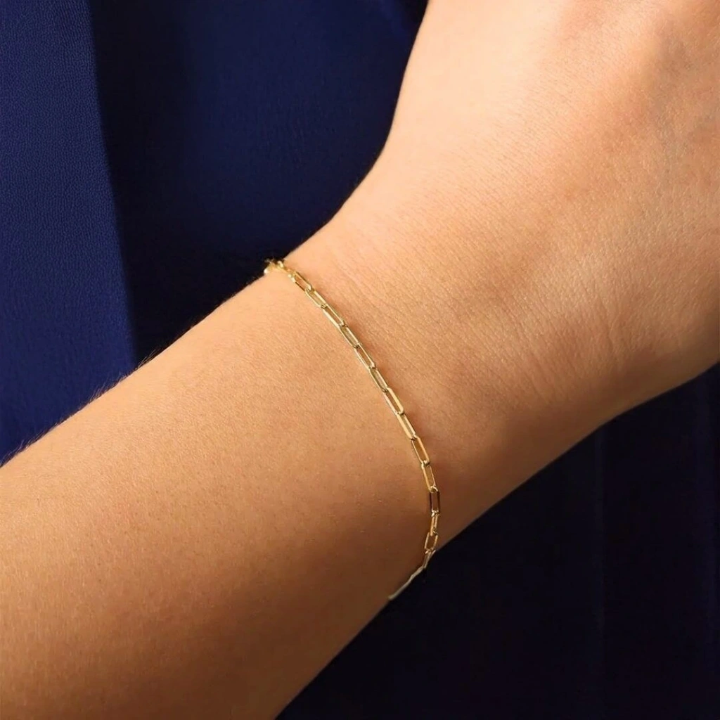 14 ayar altın ataç bileklik,stil sahibi kadınlar için tasarlanmıştır .Minimalist bir parçadır. Ataç formundaki zincir halkaları, bileğe sade ama şık bir görünüm kazandırırken, altının ışıltısını sofistike bir şekilde yansıtır.