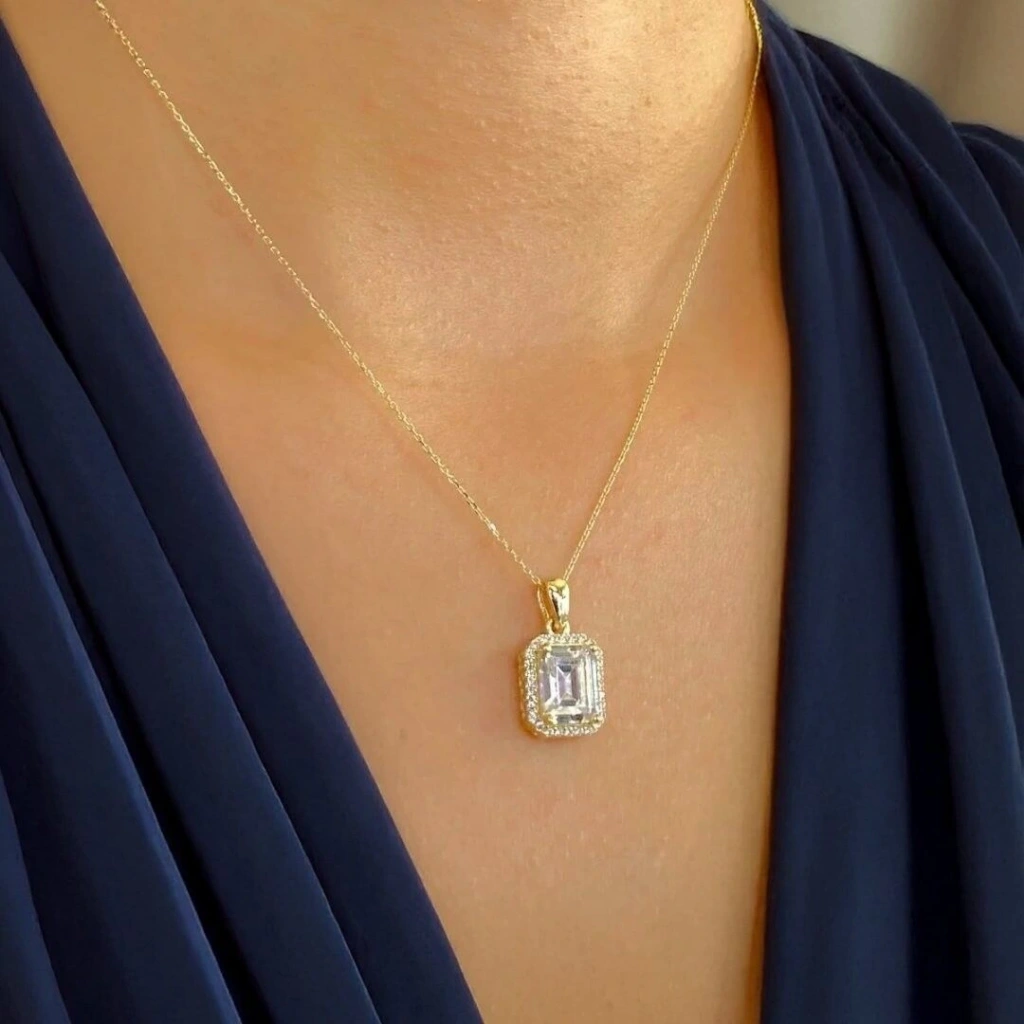 Bu altın kolye, yüksek kaliteli 14 ayar altın kullanılarak üretilmiştir. Altının parlaklığı ve dayanıklılığı ile dikkat çeker. Baget kesimli taşlarla süslenmiş olan kolye, modern ve şık bir görünüm sunar.