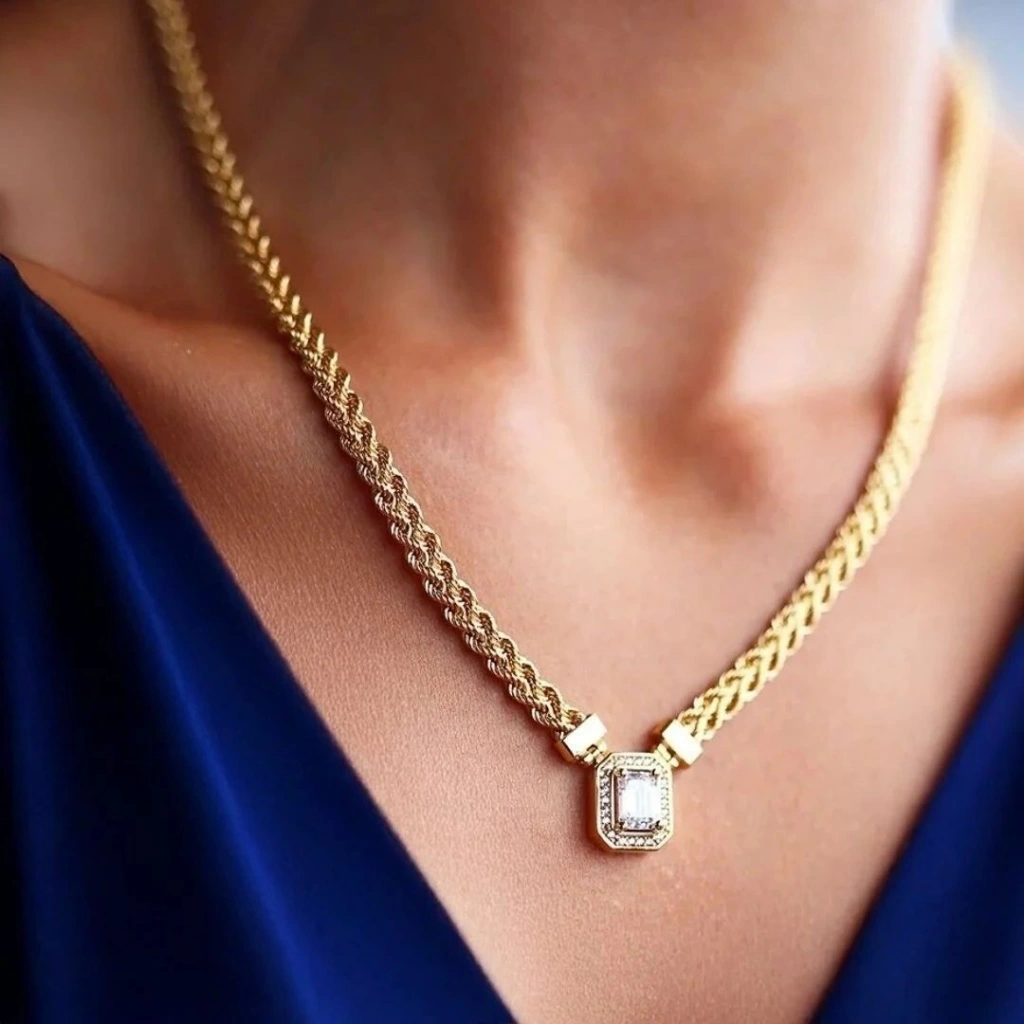 - Baget Taş Detayı: Baget taşlarla bezeli tasarım, kolyeye modern ve sofistike bir hava katmaktadır.
