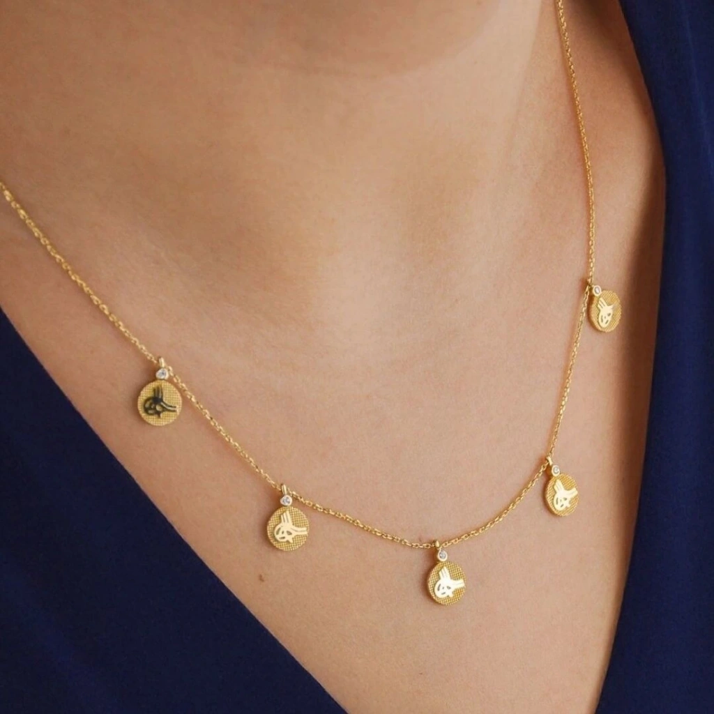 Evla Kuyumculuk'un özgün ve zarif tasarımlarından biri olan 14 Ayar Altın Beşli Tuğra Kolye, büyüleyici bir görünüm ve anlam dolu bir tasarıma sahiptir. Bu özel kolye, 3,20 gram ağırlığındaki 14 ayar altınla özenle işlenmiştir. Kolyenin beşli tuğra motifli tasarımı, zarafeti ve tarihi bir dokunuşu bir araya getirirken, altının parlaklığı da dikkat çekici bir şekilde öne çıkar. Evla Kuyumculuk, bu kolyeyi özgün bir stil ile tasarlamış ve her ayrıntısına özen göstermiştir.