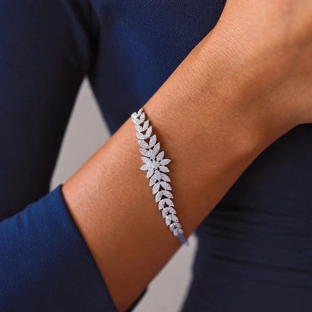 Bileklik, 19 cm uzunluğundadır ve çiçek motifli zincir şeklindedir.