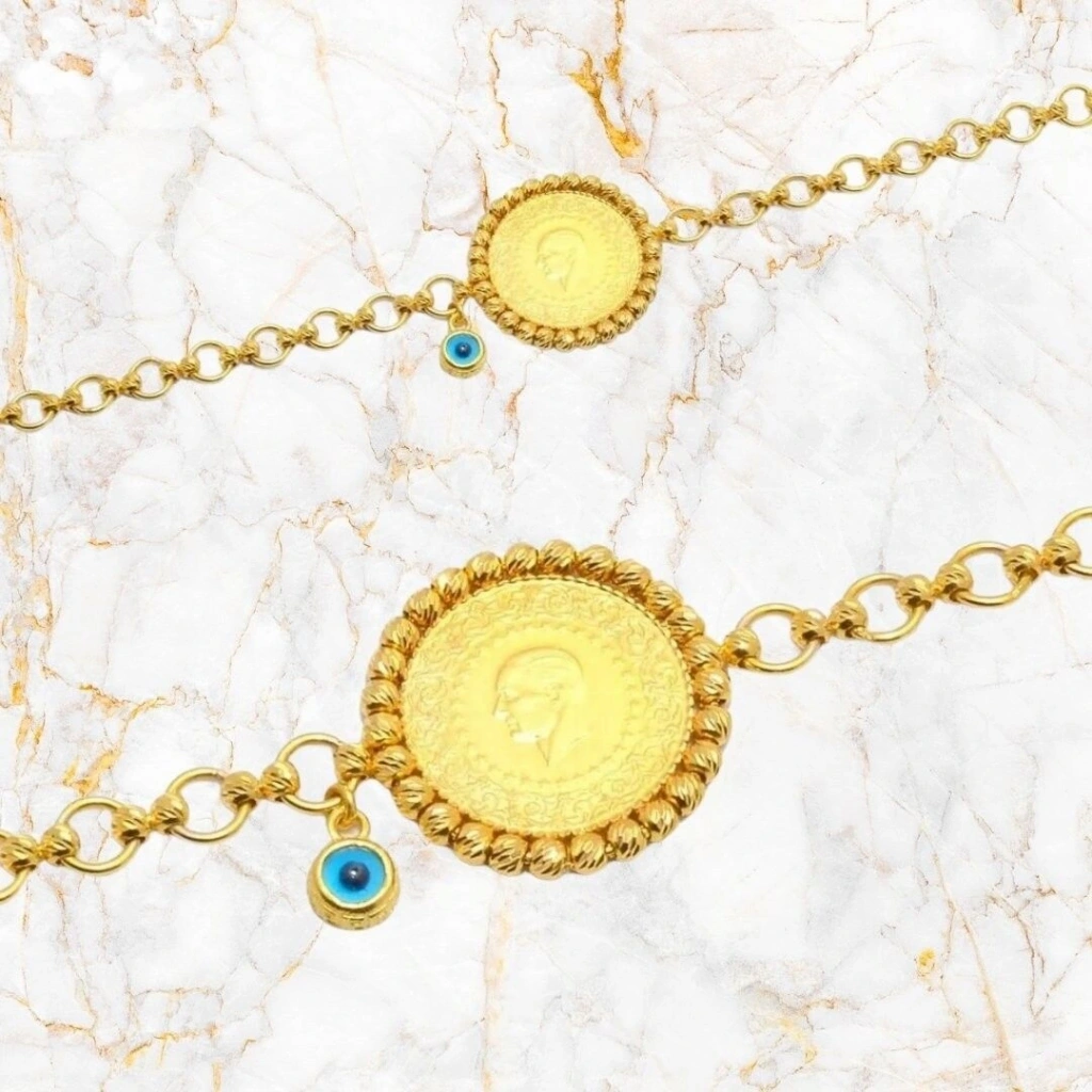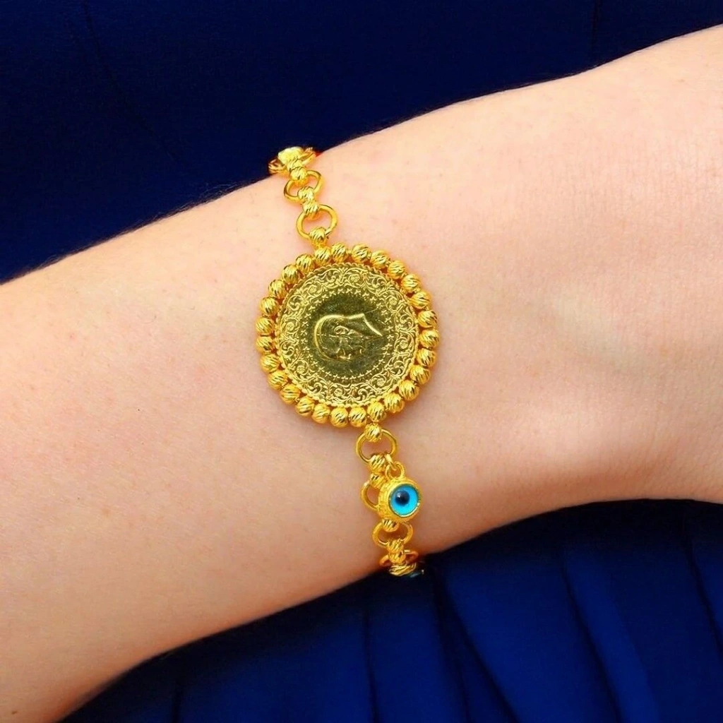 Evla Kuyumculuk'un özel tasarımı olan 14 Ayar Altın Çeyrekli Bileklik, zarif ve değerli bir takı parçasıdır. Bu bileklik, yüksek kaliteli 14 ayar altından üretilmiş olup, şıklığı ve zarafeti bir arada sunar. Bilekliğin ana özelliği, 7,94 gram ağırlığındaki altın çeyrek ve çeyrek dahildir. Altın çeyrek, bilekliğe benzersiz bir değer ve anlam katar. Ayrıca, bileklikte yer alan çeyrek, bilekliğin çekiciliğini ve zarafetini vurgular.