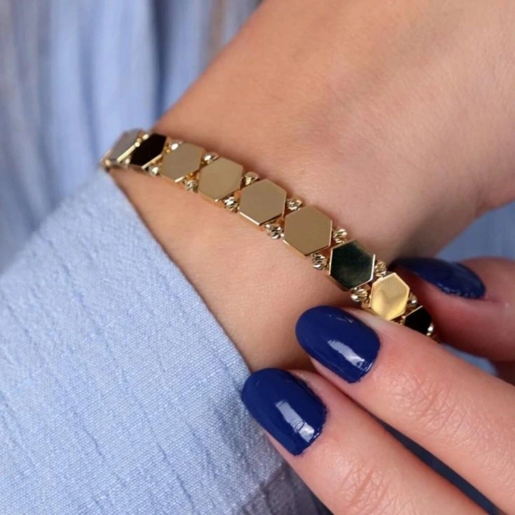 Zarif dorika boncukların modern küp formuyla buluştuğu bu 14 ayar altın kelepçe, hem günlük kullanımda hem de özel günlerde şıklığınızı tamamlar.