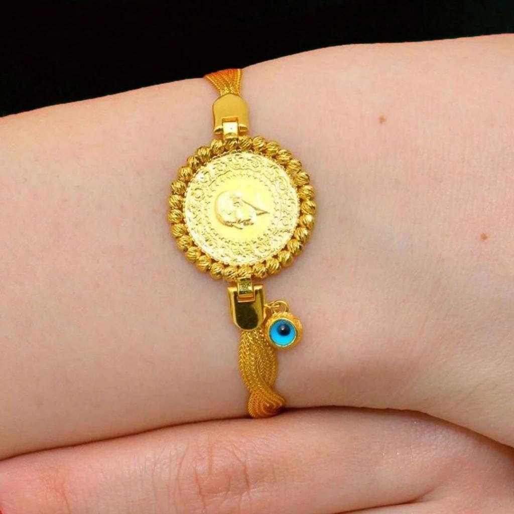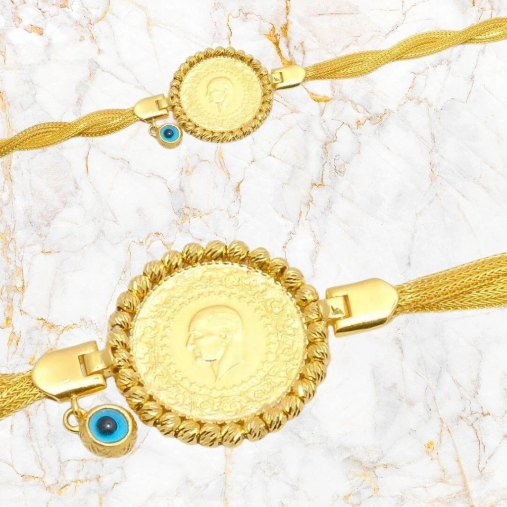 14 Ayar Altın Geniş Örgü Çeyrekli Bileklik, 8,95 gram ağırlığında olup, hem şıklığı hem de zarafetiyle öne çıkar. Bileklik tasarımının çeyrek kısmı 22 ayar altından, kenar kısımları ise 14 ayar altından üretilmiştir. Bu kombinasyon, bilekliğe hem klasik hem de modern bir görünüm kazandırır.