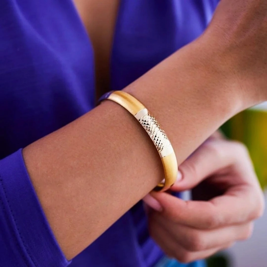 Evla Kuyumculuk'un 14 Ayar Altın İnce Bileziği, zarif ve şık bir görünüm sunan özel bir mücevherdir. Bu altın bilezik, yüksek kaliteli 14 ayar altından üretilmiş ve zarafetiyle öne çıkar. Bilezik, 14 ayar altın kullanılarak özenle üretilmiştir. 14 ayar altın, altının saflık oranını ifade eden bir derece olan 14 ayarı kullanır. Bu bilezikte kullanılan altın, parlak bir görünüm sunar ve dayanıklı bir yapıya sahiptir. Kaliteli işçilikle hazırlanmıştır.