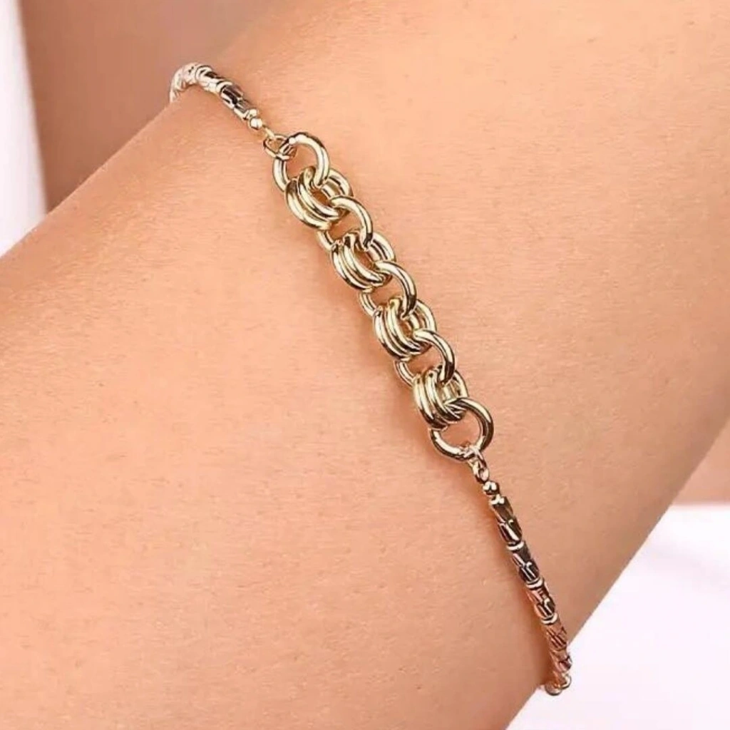 Sarı altın rengiyle dikkat çekerken, dorika boncukları bilekliğe sofistike bir ışıltı katmaktadır.
