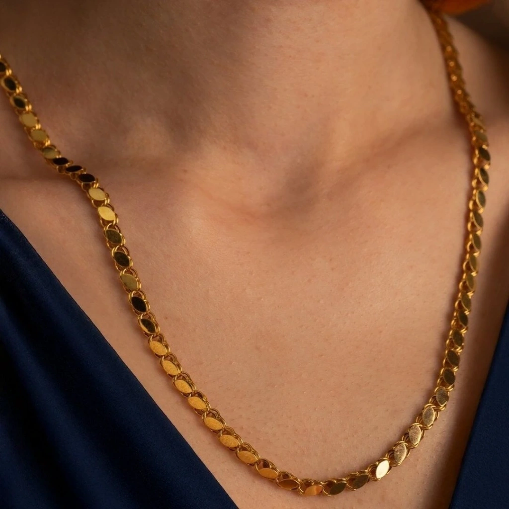 Evla Kuyumculuk’un en sevilen tasarımlarından biri olan 14 Ayar Altın Kalın Pullu Zincir 11,90, 11,90 gram ağırlığında ve 50 cm uzunluğundadır. Zincir, şık ve modern bir görünüm sunan kalın pullu zinciri tasarımına sahiptir.