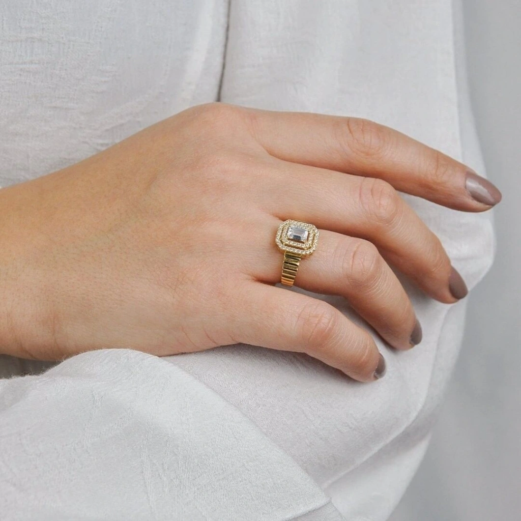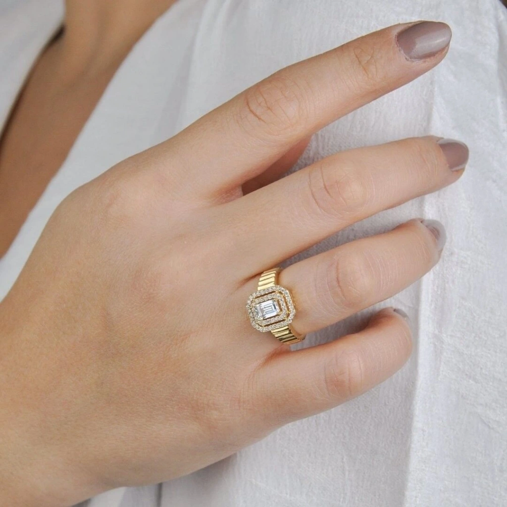 Evla Kuyumculuk tarafından özenle üretilen 14 ayar altın merdiven baget yüzük, şık ve modern bir görünüme sahip. Merdiven şeklindeki tasarımı ile dikkat çeken yüzük, hem zarif hem de modern bir görünüm sunuyor. Yüzük, 14 ayar altından üretilmiştir ve 3,16 gram ağırlığındadır.