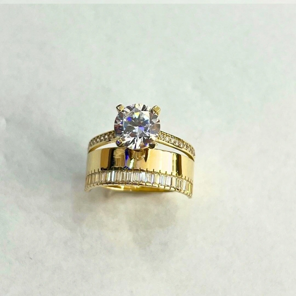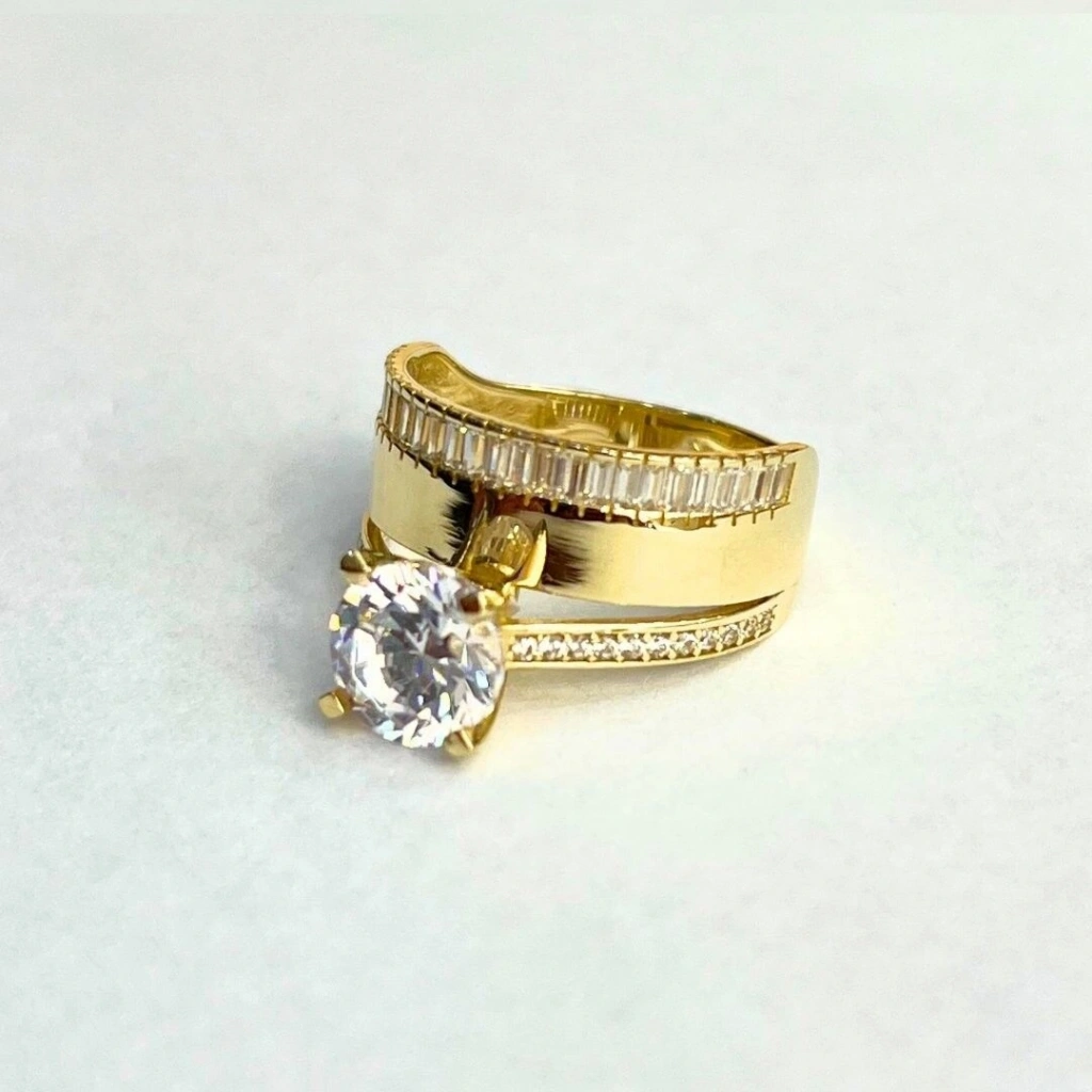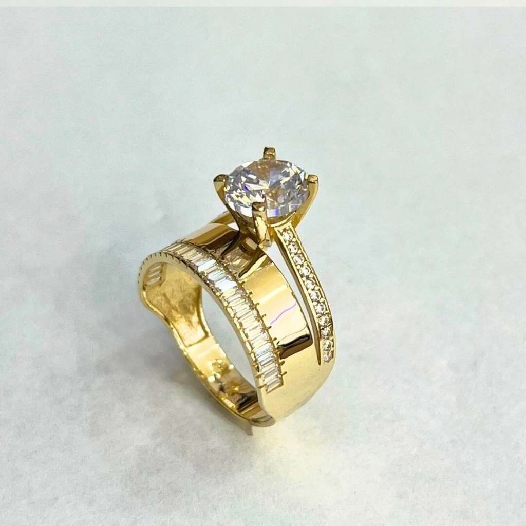Kaliteli 14 ayar altından üretilmiş olan bu alyans, mini baget kesimli taşları ve merkezdeki klasik tektaşı ile modern bir zarafet sunar.