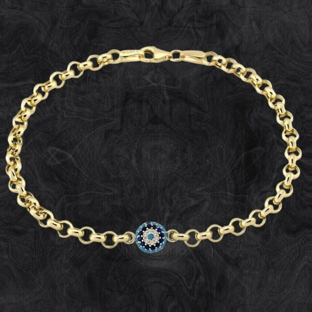 Evla Kuyumculuk'un 14 Ayar Altın Nazarlı Taşlı Bileklik ürünü, zarafet ve korumayı bir arada sunan özel bir mücevherdir.