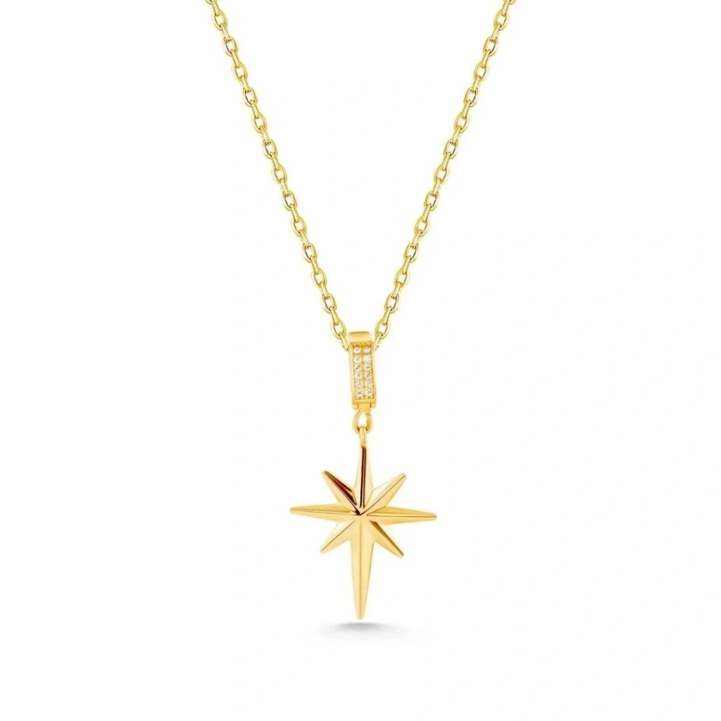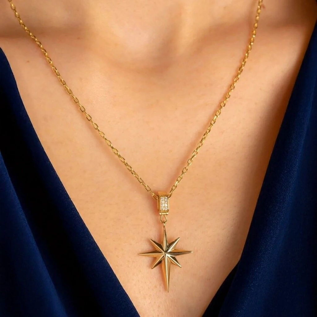 Evla Kuyumculuk’un bu şık kolyesi, her yaştan kadına hitap eden şık ve modern bir tasarıma sahiptir. Kolye, 14 ayar altın kullanılarak üretilmiştir. Kolyenin üzerinde, şık bir şekilde tasarlanmış bir adet kutup yıldızı figürü bulunmaktadır. kutup yıldızı figürleri, saflık, masumiyet ve şansın sembolü olarak kabul edilir.