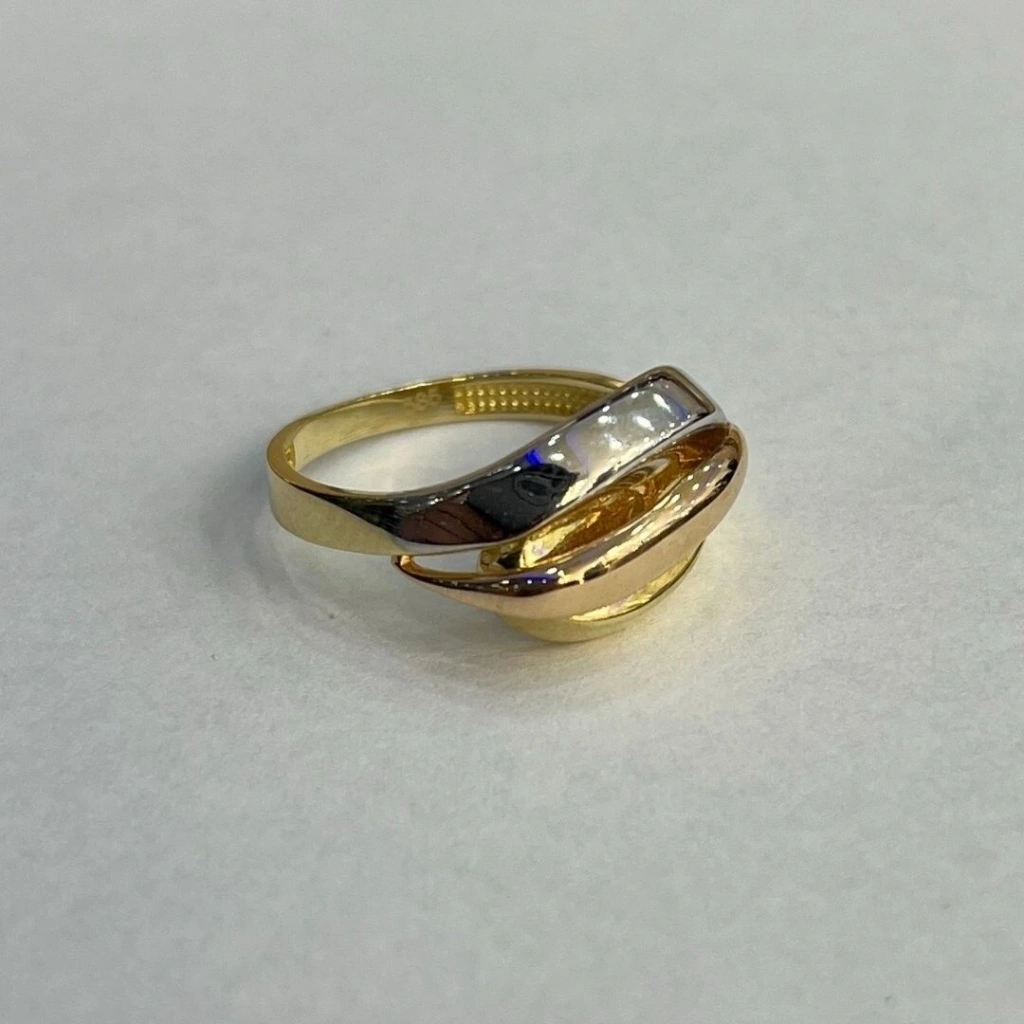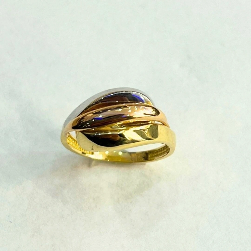 Yüzüğün sade tasarımı, renkli altın detaylarıyla zenginleştirilmiştir ve minimalist bir estetik sunar.