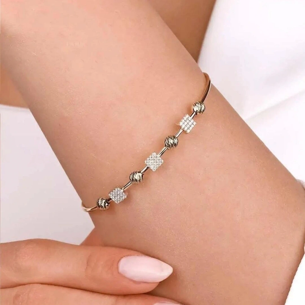 Bu 14 Ayar Altın Taşlı Dorika Bileklik, Evla Kuyumculuk tarafından özenle tasarlanmıştır . Zarif bir mücevherat parçasıdır. Yüksek kaliteli malzemeler kullanılarak yapılmıştır ve şıklığı ile dikkat çekmektedir. Bu 14 Ayar Altın Taşlı Dorika Bileklik, 14 ayar altın kullanılarak üretilmiş olup 4,31 gram ağırlığındadır. İtalyan Dorika tasarımına sahiptir ve üzerinde taşlarla süslenmiştir. Altın halkalar ve zarif taşlar, bileğe mükemmel bir uyum sağlar ve parıltılı bir görünüm sunar. Taşlı Dorika bileklik, herhangi bir kıyafeti tamamlayacak şık bir aksesuardır. İnce ve zarif tasarımıyla günlük yaşamda veya özel etkinliklerde stilinize sofistike bir dokunuş katar.