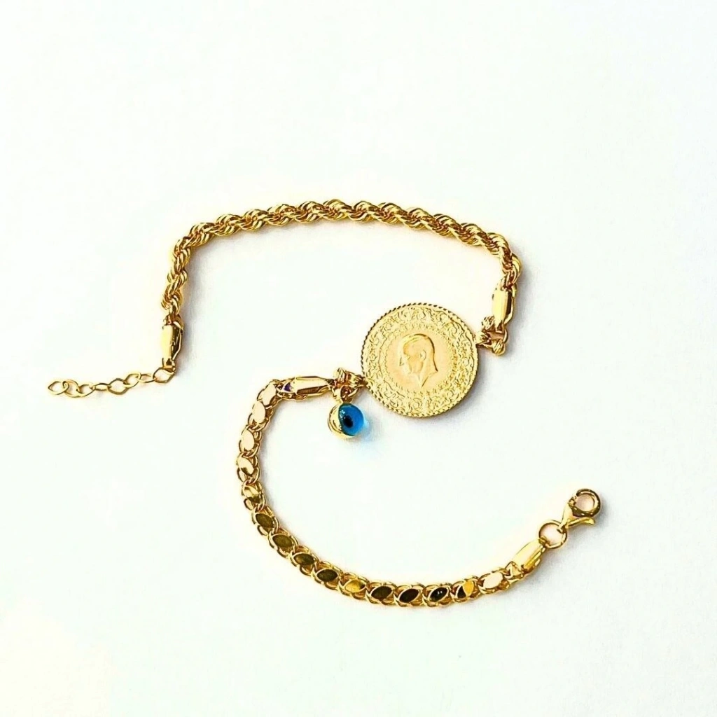 Bu 14 Ayar Pullu Halat Çeyrekli Bileklik, şıklığı ve zarafeti bir araya getiren özel bir tasarımdır. 5,05 gram ağırlığındaki bu bileklik, hem geleneksel hem de modern unsurları barındıran bir yapıya sahiptir. Halat tarzındaki örgü tasarımı, bilekliğe sağlamlık katarken, üzerindeki pullar ve çeyrek altın, bileziğe zarif bir ışıltı ve anlam kazandırır.