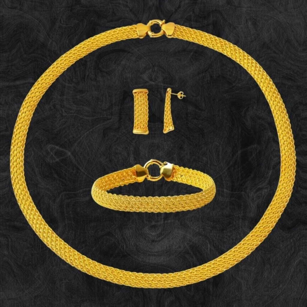 Bu 8 Ayar Altın 5 Sıra Hasır Örgülü Set Takımı,Evla Kuyumculuk tarafından özenle tasarlanmıştır ve üretilmiştir . Bir mücevherat setidir. Yüksek kaliteli malzemeler kullanılarak yapılmış ve şıklığı ile dikkat çekmektedir. Bu set, 8 ayar altın kullanılarak üretilmiştir ve toplamda 24,60 gram ağırlığındadır. Hasır örgülü tasarımıyla öne çıkar ve modern bir görünüm sunar. Set, bileklik, kolye ve küpe gibi farklı parçaları içermektedir.