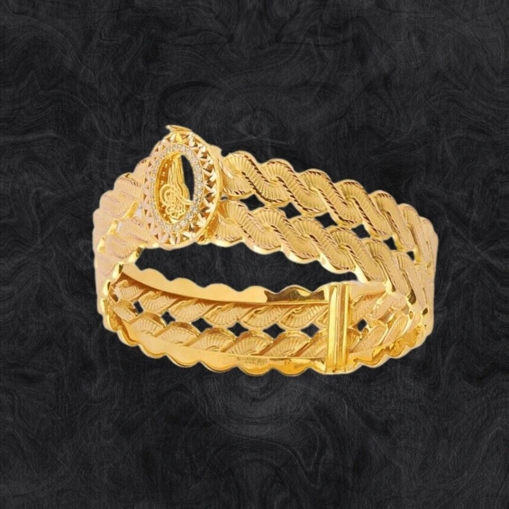 Bu 8 Ayar Altın Tuğralı Trabzon Hasır Kelepçe, EvlaKuyumculuk tarafından özenle tasarlanmıştır . Bir mücevherat ürünüdür. Yüksekkaliteli malzemeler kullanılarak yapılmış ve benzersiz tasarımıyla dikkatçekmektedir. Bu kelepçe, 8 ayar altın kullanılarak üretilmiştir ve toplamda16,65 gram ağırlığındadır. Üzerindeki tuğra detayları, Osmanlı İmparatorluğu'nunsembolik bir ifadesini taşır ve kelepçeye tarihi bir ruh katmaktadır. Aynızamanda Trabzon hasırı deseniyle süslenmiştir, bu da ona eşsiz bir karakter vegörsel zenginlik katmaktadır. Kelepçe şeklindeki tasarımı modern ve zarif birgörünüm sunar.