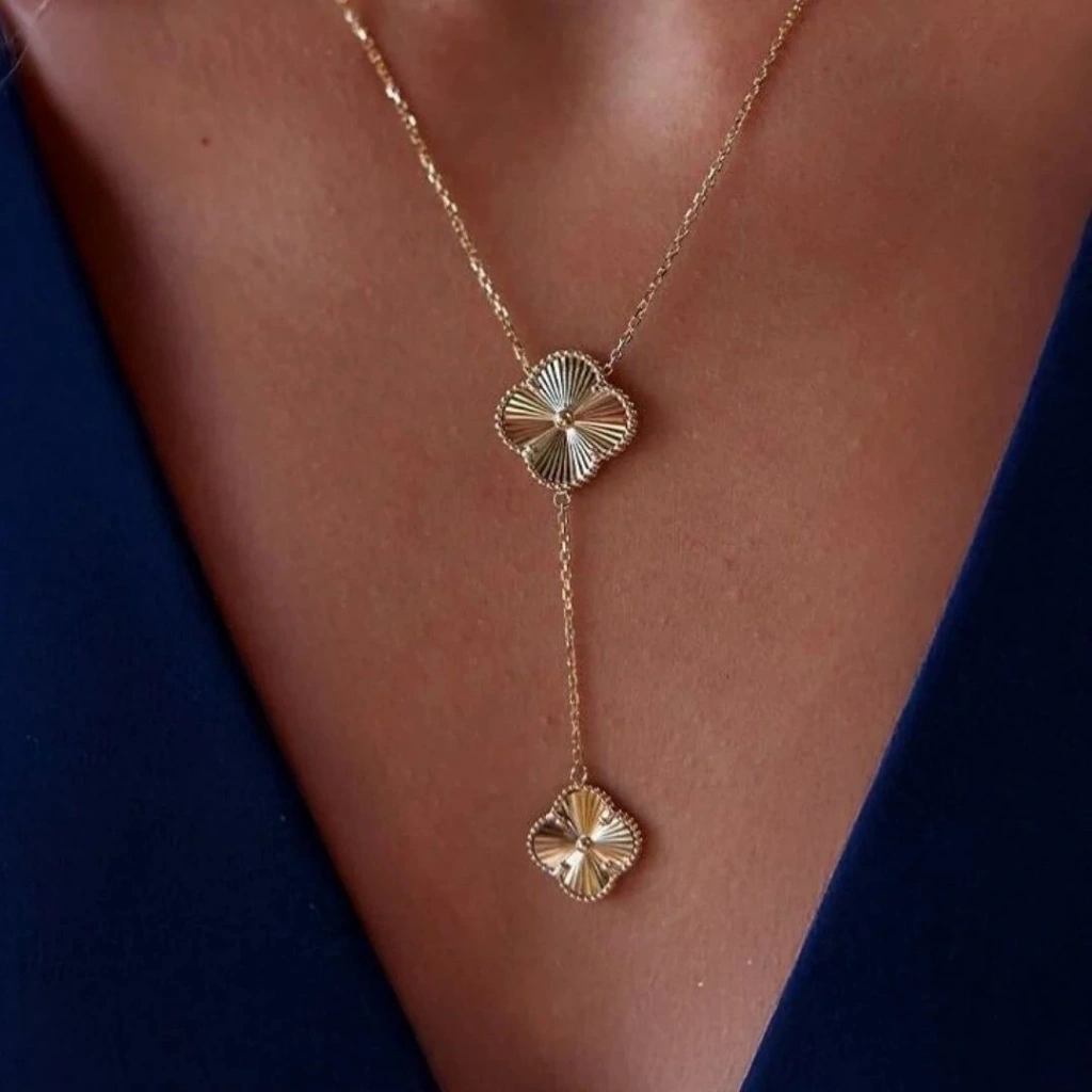 İkili Yonca Tasarımı: Şans ve zarafeti temsil eden yonca detayları, kolyeye benzersiz bir görünüm kazandırır.