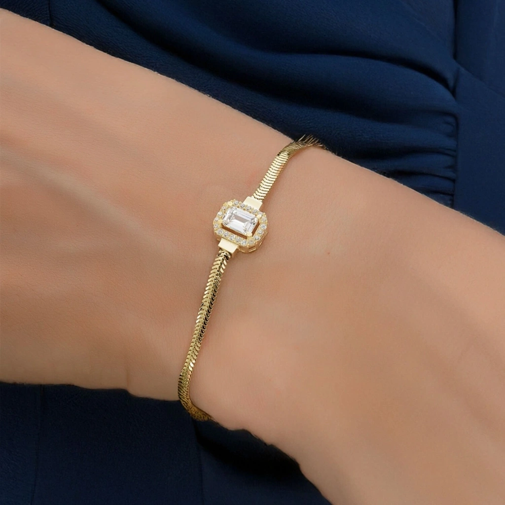 Altın Baget Balıksırtı Bileklik Baget taşlı, balıksırtı desenli 8 ayar altın bileklik. Sertifikalı, 3.6 gr, 18-21 cm uyumlu.