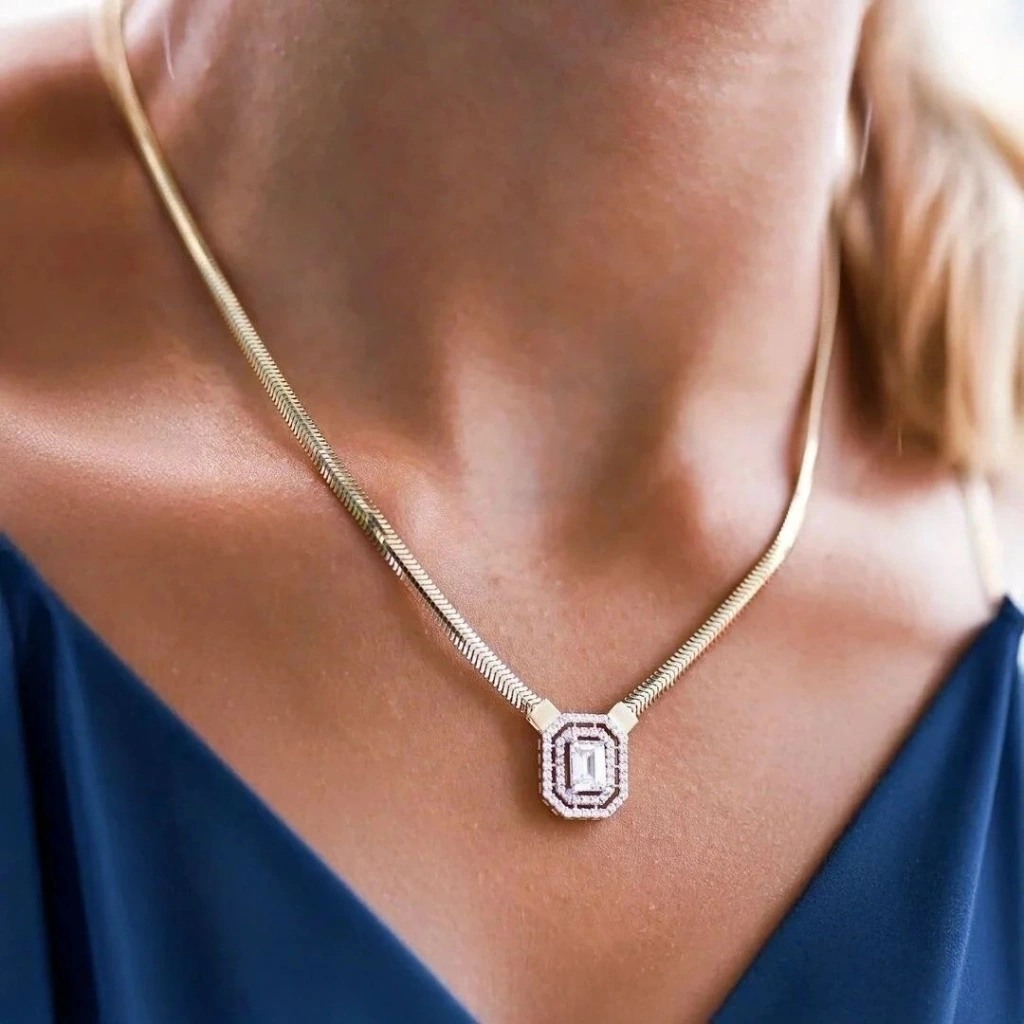 Zarafeti ve modern detayları bir araya getiren 14 Ayar Altın Balık Sırtı Baget Kolye, göz alıcı duruşuyla stilinize değer katıyor.