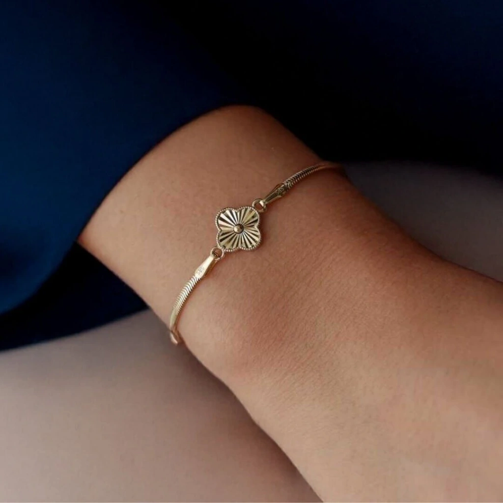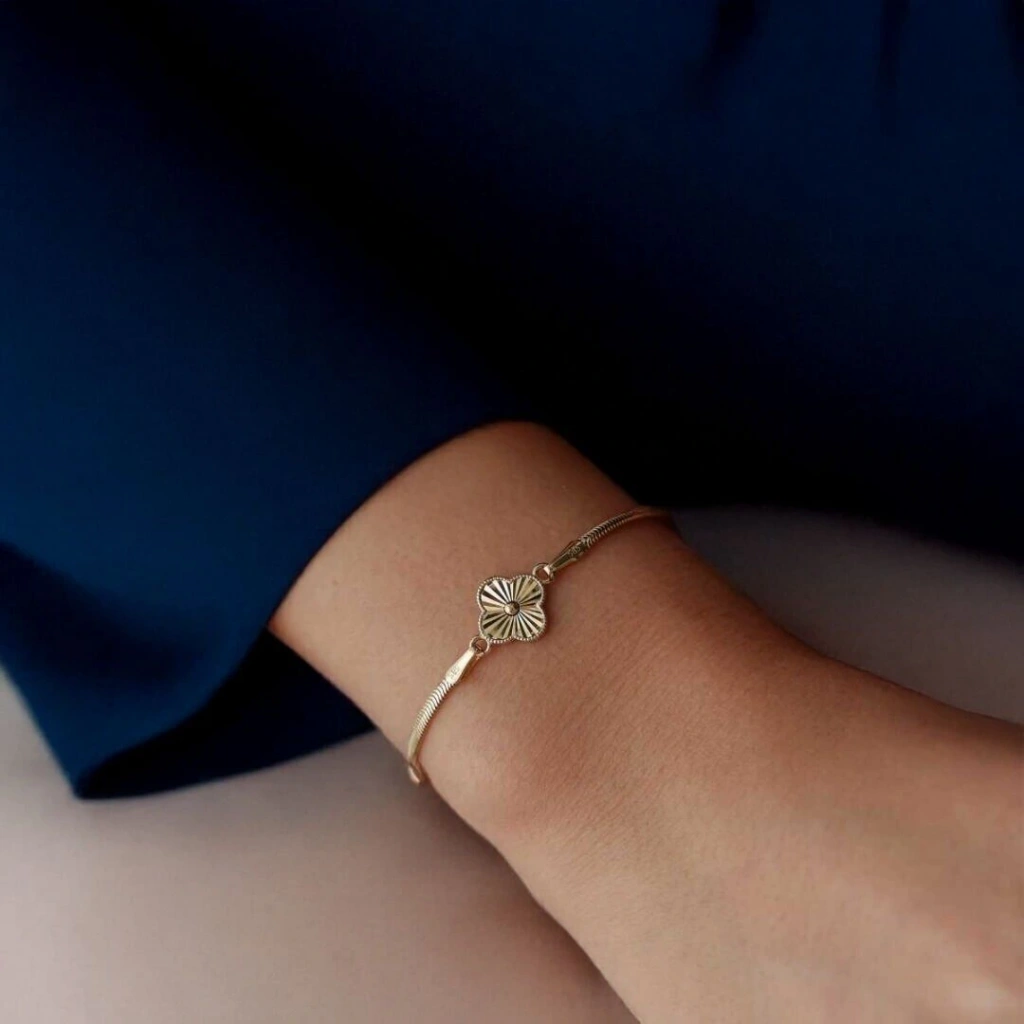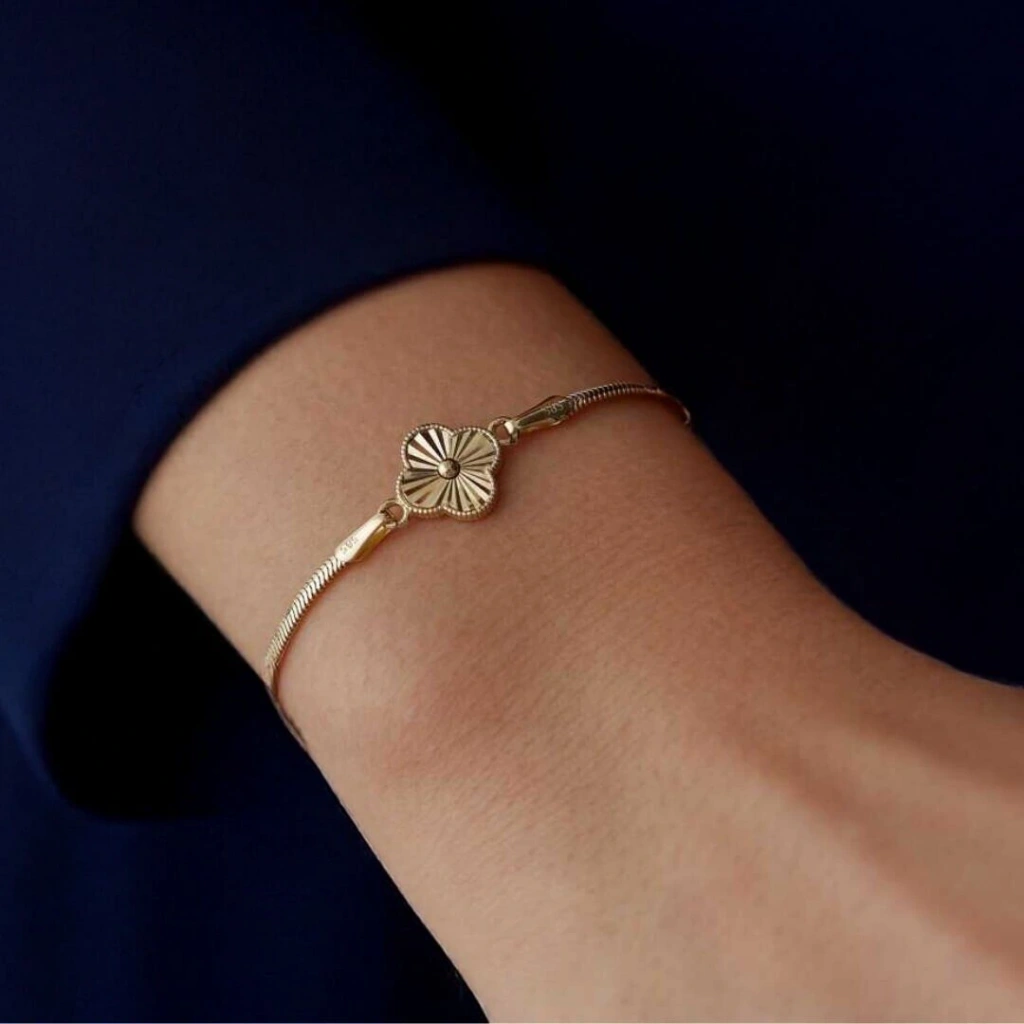 14 Ayar Altın Balıksırtı Yonca Bileklik, zarafeti ve şansı bir arada sunan özel bir takı modelidir.