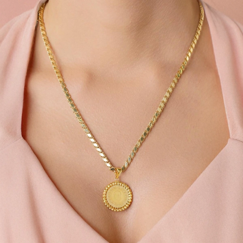 Altın Çeyrekli Kolye, hem modern hem geleneksel takı sevenler için tasarlanmış özel bir modeldir.