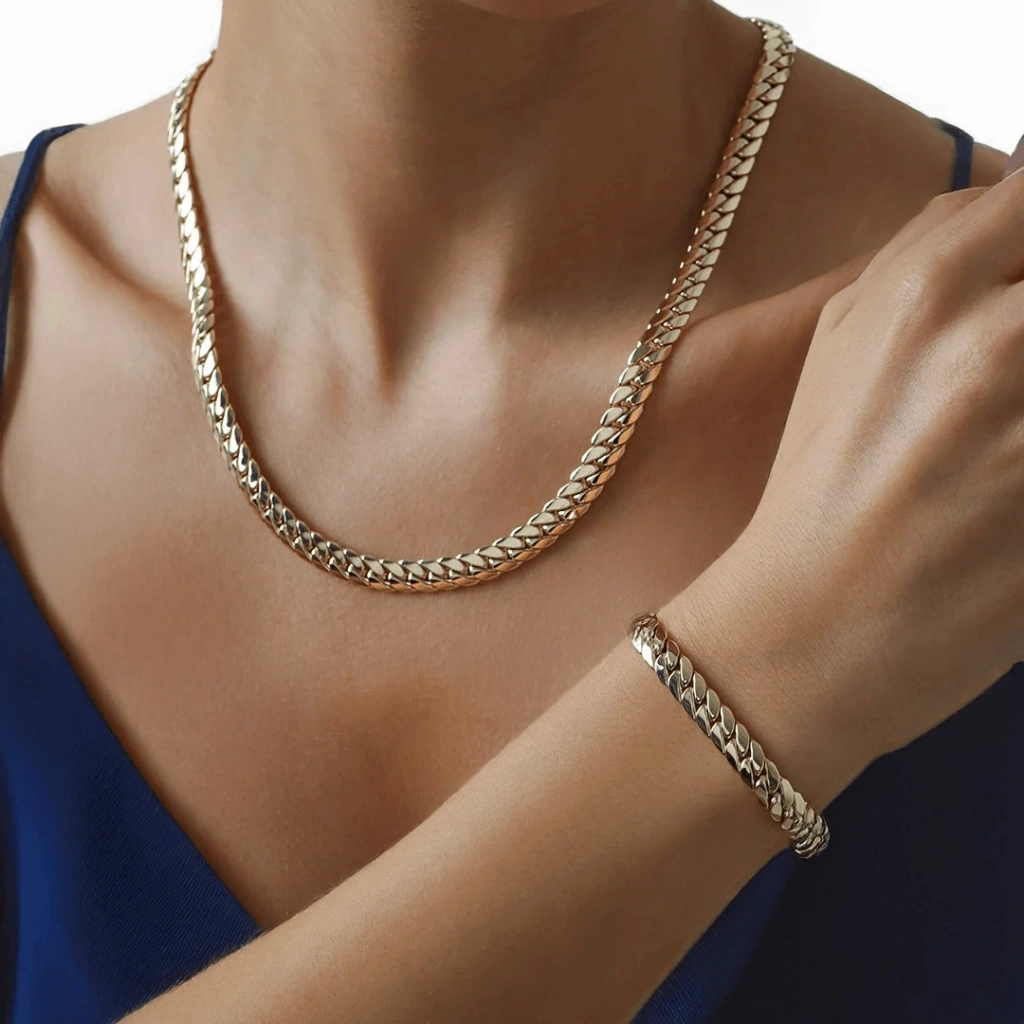 Bu set, stilinizi tamamlayacak ve her durumda göz alıcı bir görünüm elde edebileceğiniz harika bir seçenektir. Altın gurmet zincirli set takımı, hediye olarak da düşünebileceğiniz değerli bir tercihtir.