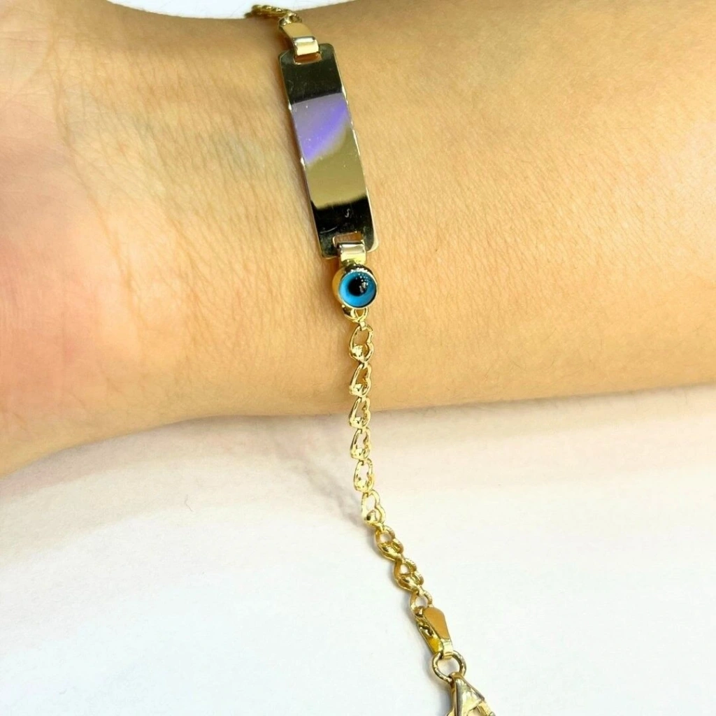 Bu 8 ayar altın nazarlı çocuk bilekliği, hem zarif görünümü hem de dayanıklı yapısıyla çocuklar için mükemmel bir hediye seçeneğidir.