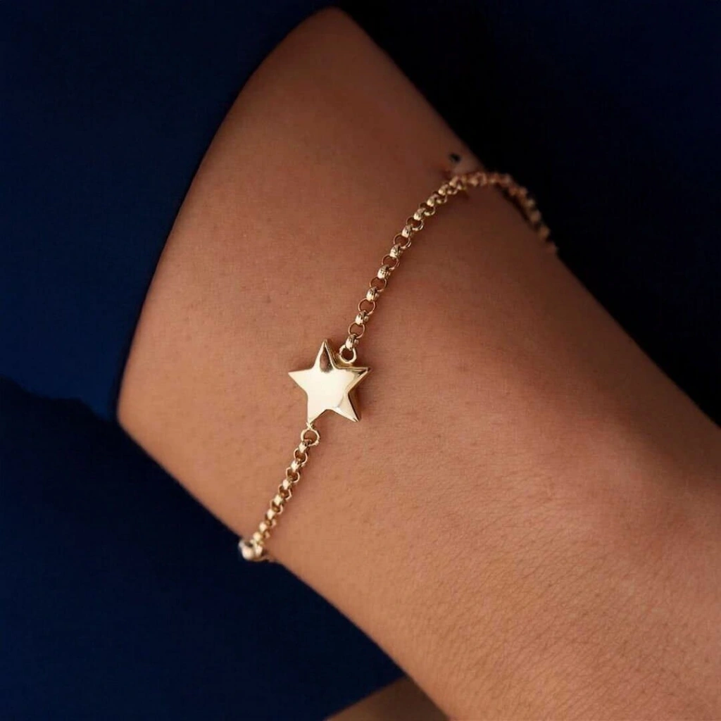 Altın Zincirli Yıldız Bileklik, zarif zincir yapısı ve yıldız motifiyle sade şıklığı bir araya getiriyor.