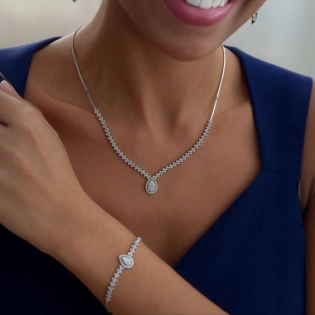 Zarif çizgiler, göz alıcı ışıltı ve şıklığın birleştiği bu özel tasarım Beyaz Altın Damla Set Takımı, modern stilin en etkileyici yansımalarından biridir.
