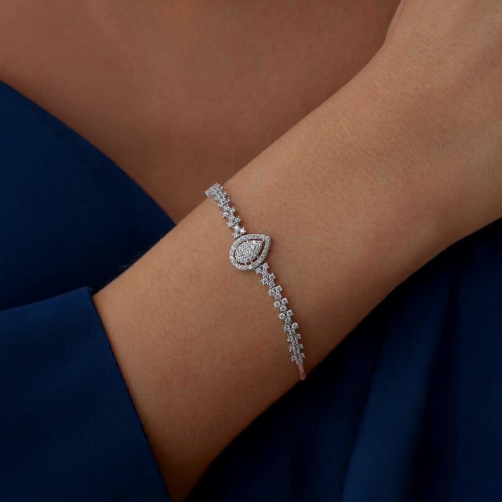 14 ayar beyaz altın ile hazırlanan bu set; kolye, bileklik ve küpe üçlüsüyle günlük kullanımda ve özel davetlerde stilinizi tamamlar.