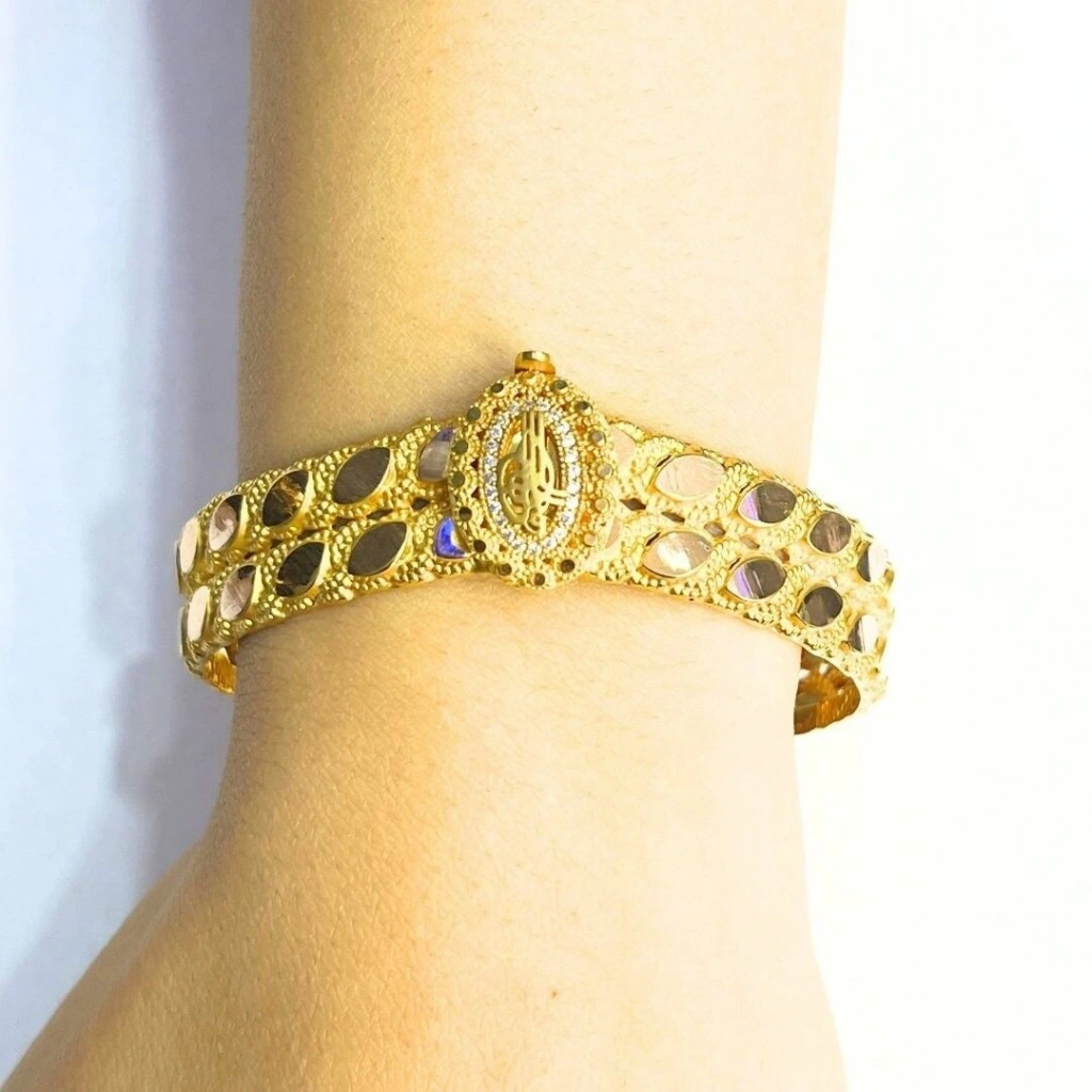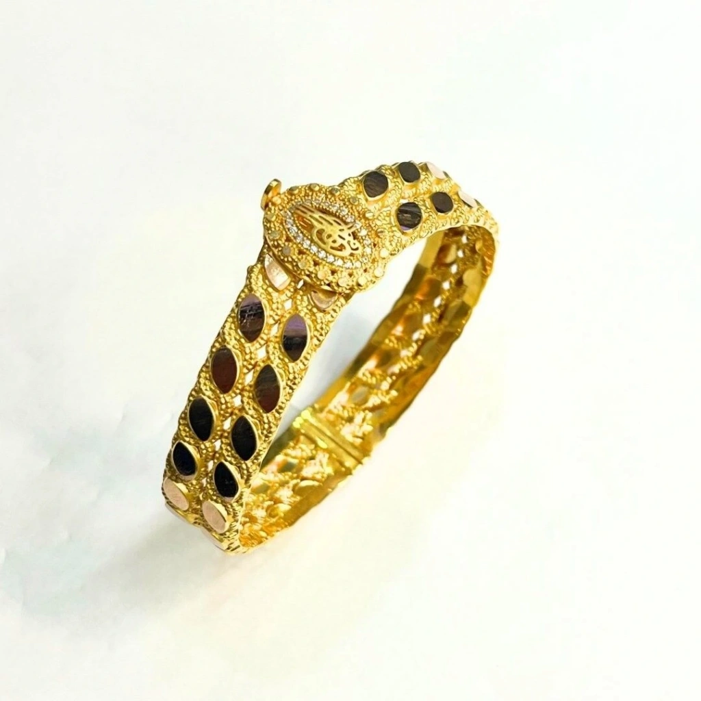 Bu 8 ayar sarı altın 2 sıra pullu tuğra kelepçe, zarif ve şık bir tasarıma sahiptir. Pullu detayları ve tuğra motifi, bilekliğe geleneksel bir hava katarak dikkat çekici bir aksesuar sunar.