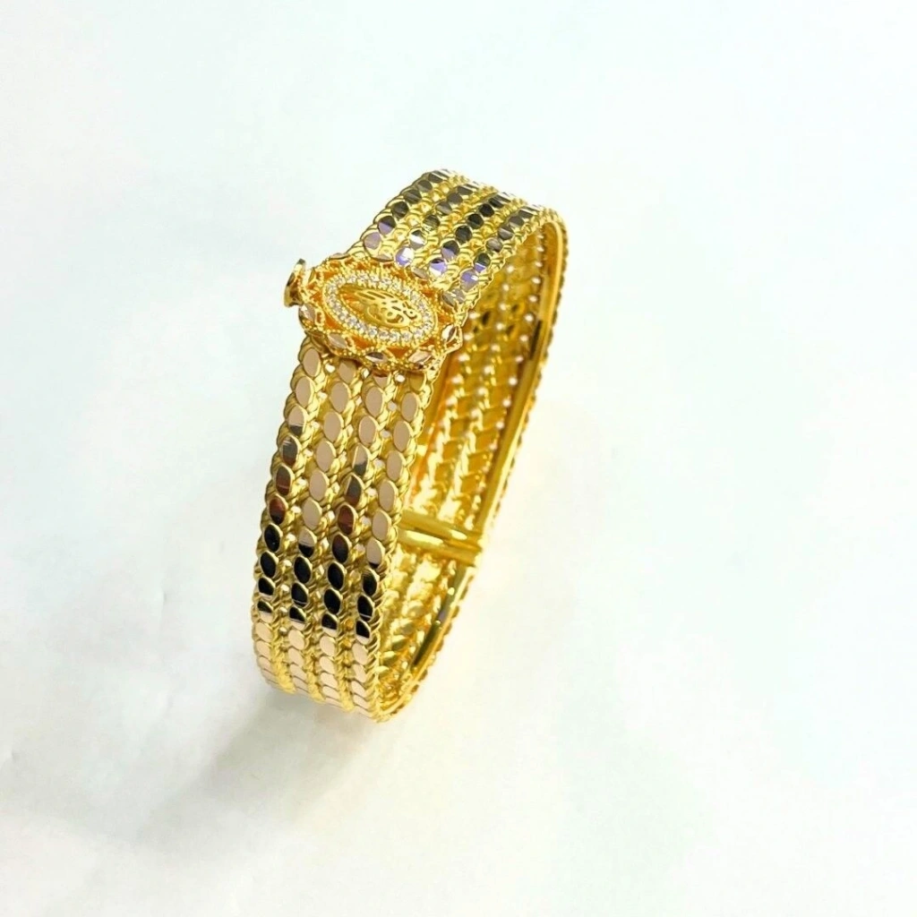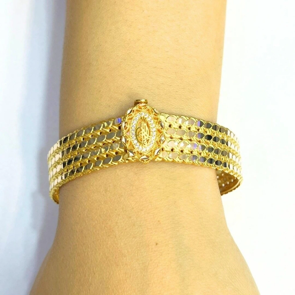 Bu 14 ayar sarı altın 4 sıra pullu tuğralı kelepçe, şık ve zarif bir tasarıma sahiptir. Tuğra motifi ile birleşen pul detayları, bilekliğe modern bir hava katarak dikkat çekici bir aksesuar oluşturur.